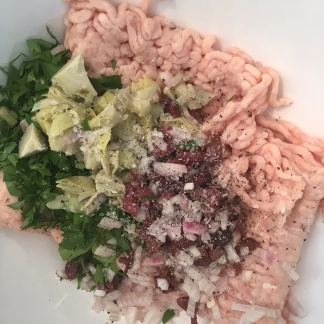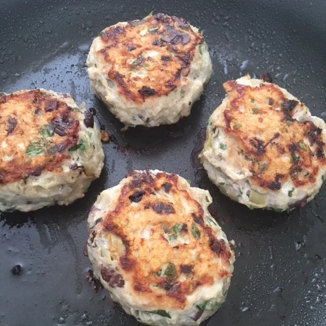 Mix together in a bowl and divide into 4 portions. Form into patties. Place on Plate while you heat 1 Tbsp Olive Oil in 10" sautee pan set to high.